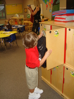 The night before John Henry’s first day, I read to him The Kissing Hand by Audrey Penn. What.Was.I.Thinking? I barely made it out of his room in one piece. It’s a sweet story about a little raccoon’s fears of starting school and a mommy raccoon who calms him with the clever “kissing hand”. She kisses his palm then closes his little hand. So, if he begins to miss his mommy, he can just open his hand and touch it to his cheek and say, “My mommy loves me.”