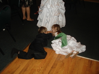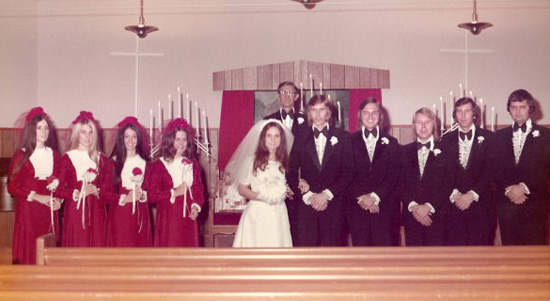 And, subsequently, forced their wedding party to wear large bow ties and red dresses with white lace that only the Amish could love. We’ll just let the awesome, red veil accessories speak for themselves.
